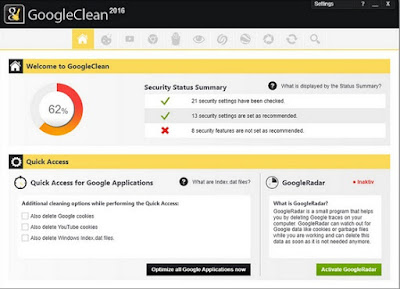 Today Google "sees" everything. Most Google products like Google Desktop, Google Chrome, Google Picasa, Google Earth and Google Toolbar collect data about the usage, generate a unique ID and transfer them back to Google. GoogleClean can prevent this and switches off those data transfers. It allows you to use all Google products without any headaches and without having to worry about the consequences. GoogleClean does not influence the functionality of Google products. It takes away the bad things and leaves you the good things.